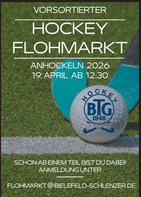 Am 19.04.2026 von 10 bis 17 Uhr startet die Feldsaison mit unserem berühmten Anhockeln kommt alle auf den Platz Am Brodhagen 54 , 33613 Bielefeld unter anderem könnt Ihr auf dem Hockey Flohmarkt das ein oder andere Schnäppchen machen.