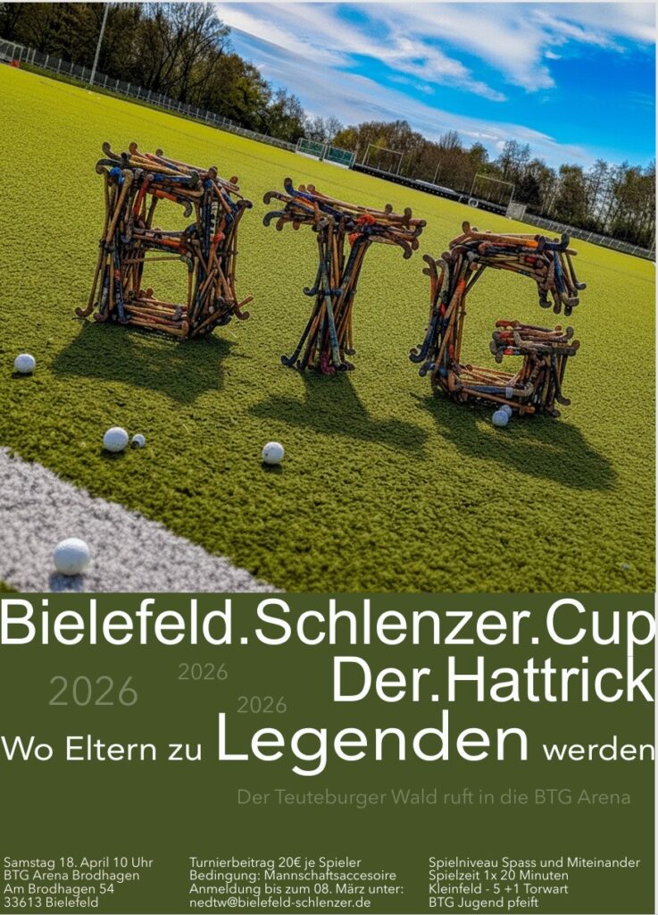 Nach dem großen Erfolg mit zahlreicher externer Teilnahme startet am 18.04.2026 nun mehr der 3. Bielefelder SchlenzerCup – das Bielefelder Elternhockeyturnier um 10 Uhr auf unserem Kunstrasenplatz Am Brodhagen 54, 33613 Bielefeld